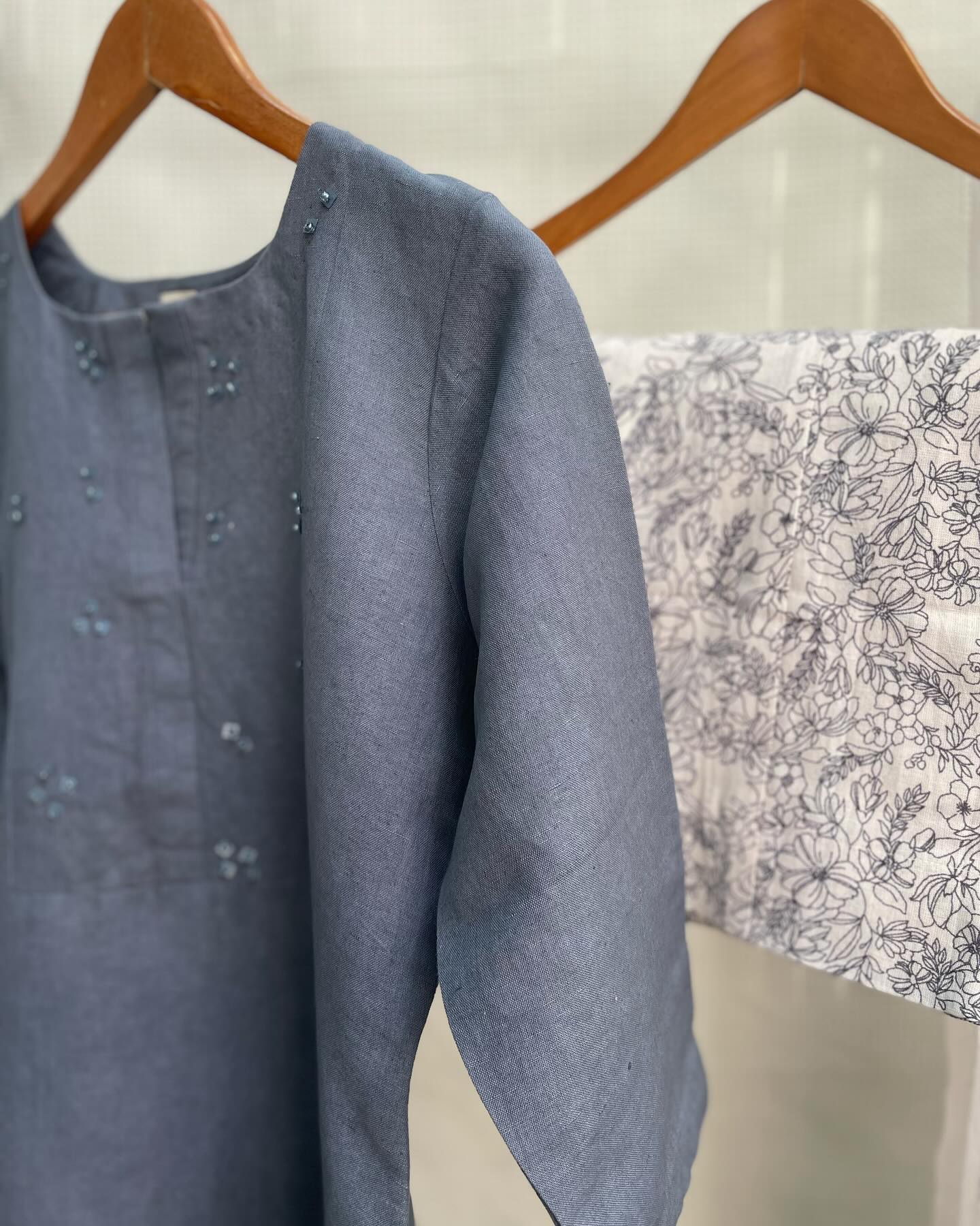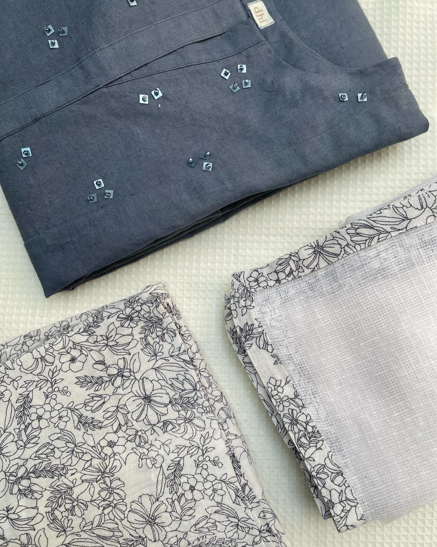 Introducing our Soft Beige set — a graceful blend of subtle florals and refined tones. The ensemble features delicate floral printed pants paired with a grey cotton linen kurta that brings effortless charm to everyday wear. Finished with a breezy Kota cotton dupatta, this look is perfect for sunlit days and slow mornings.