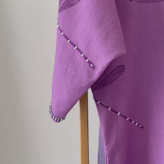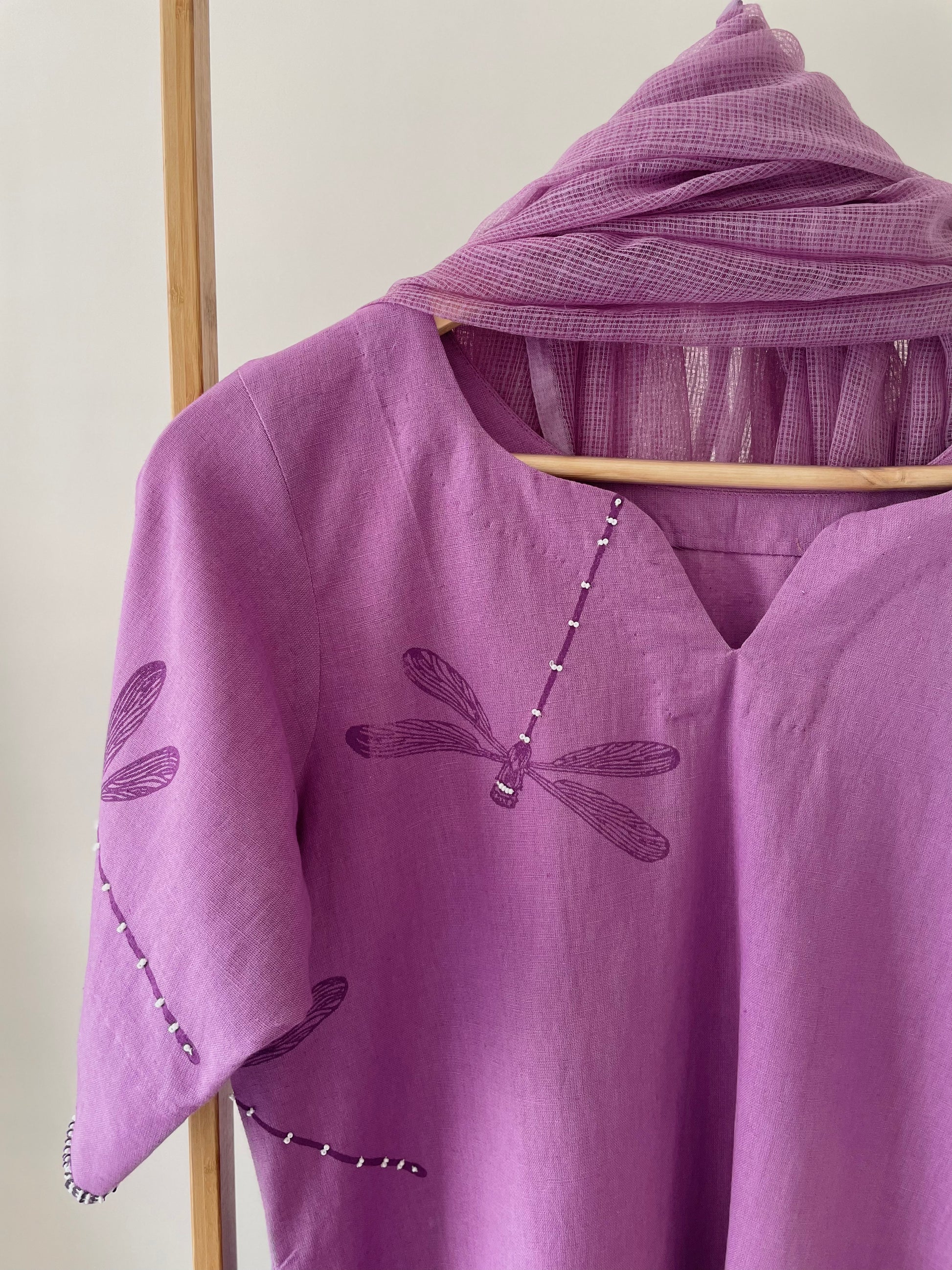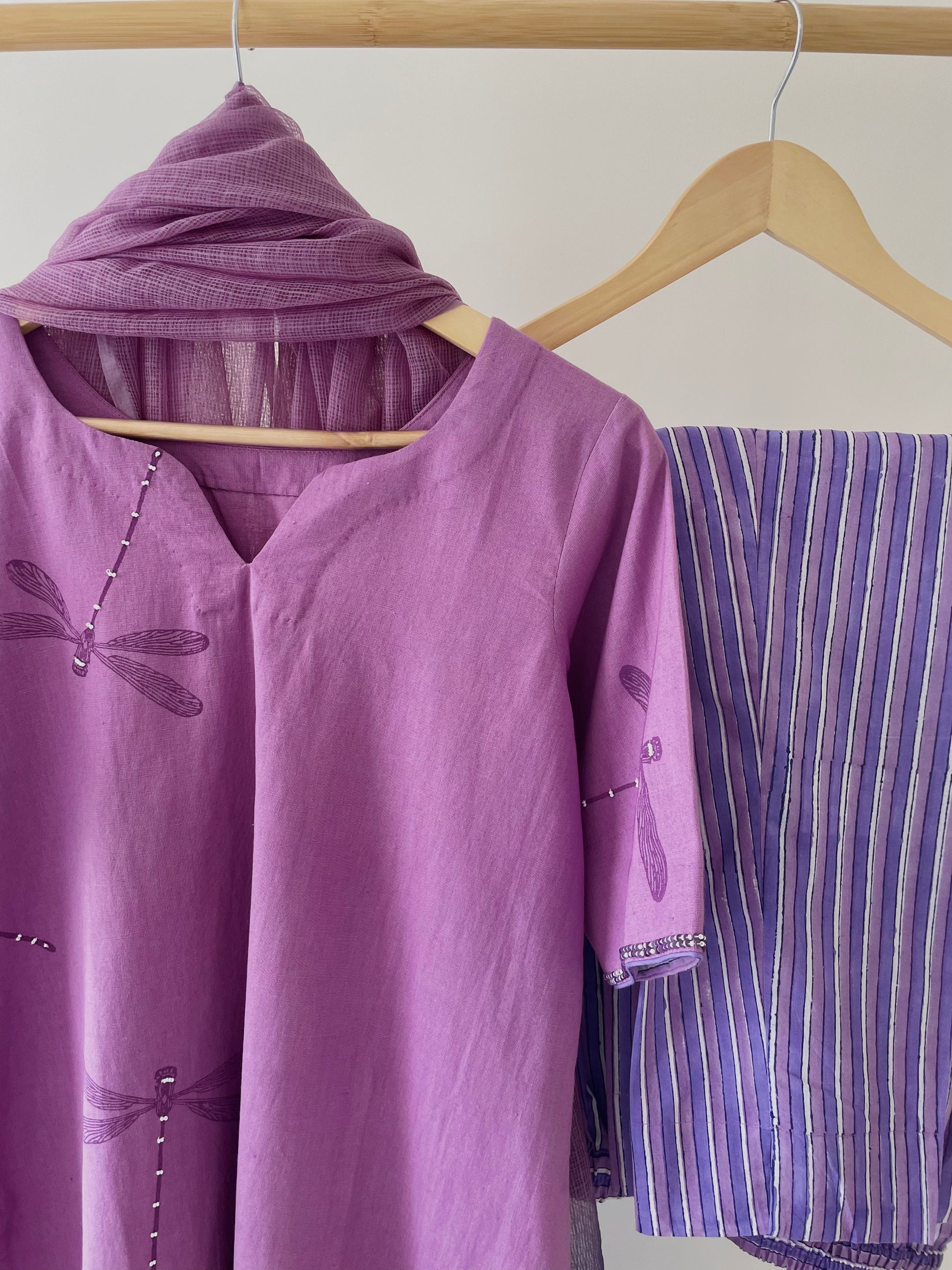 Made in bright hue with customised block print in dragonfly motif. Enhanced with hand tucked beads. Set is completed with breezy striped block printed cotton pants with pockets for your essentials. A dual tone kota dupatta to complete the look.