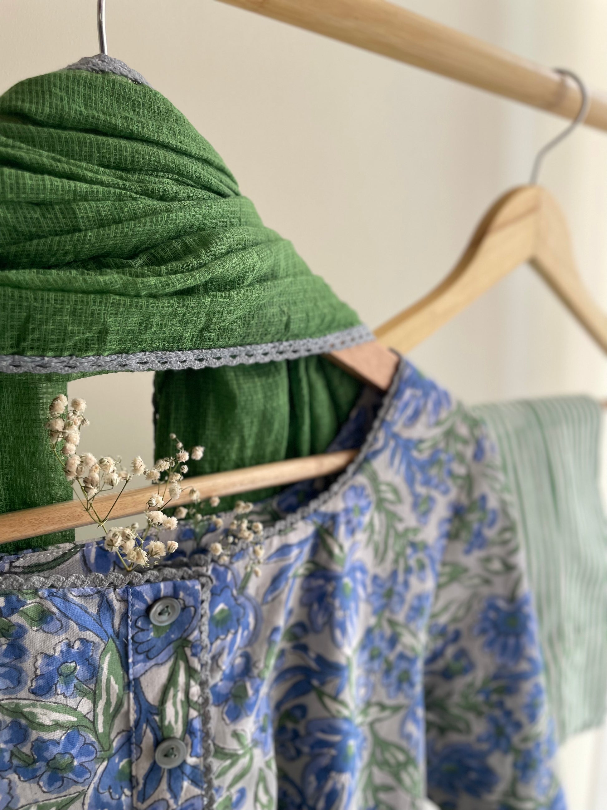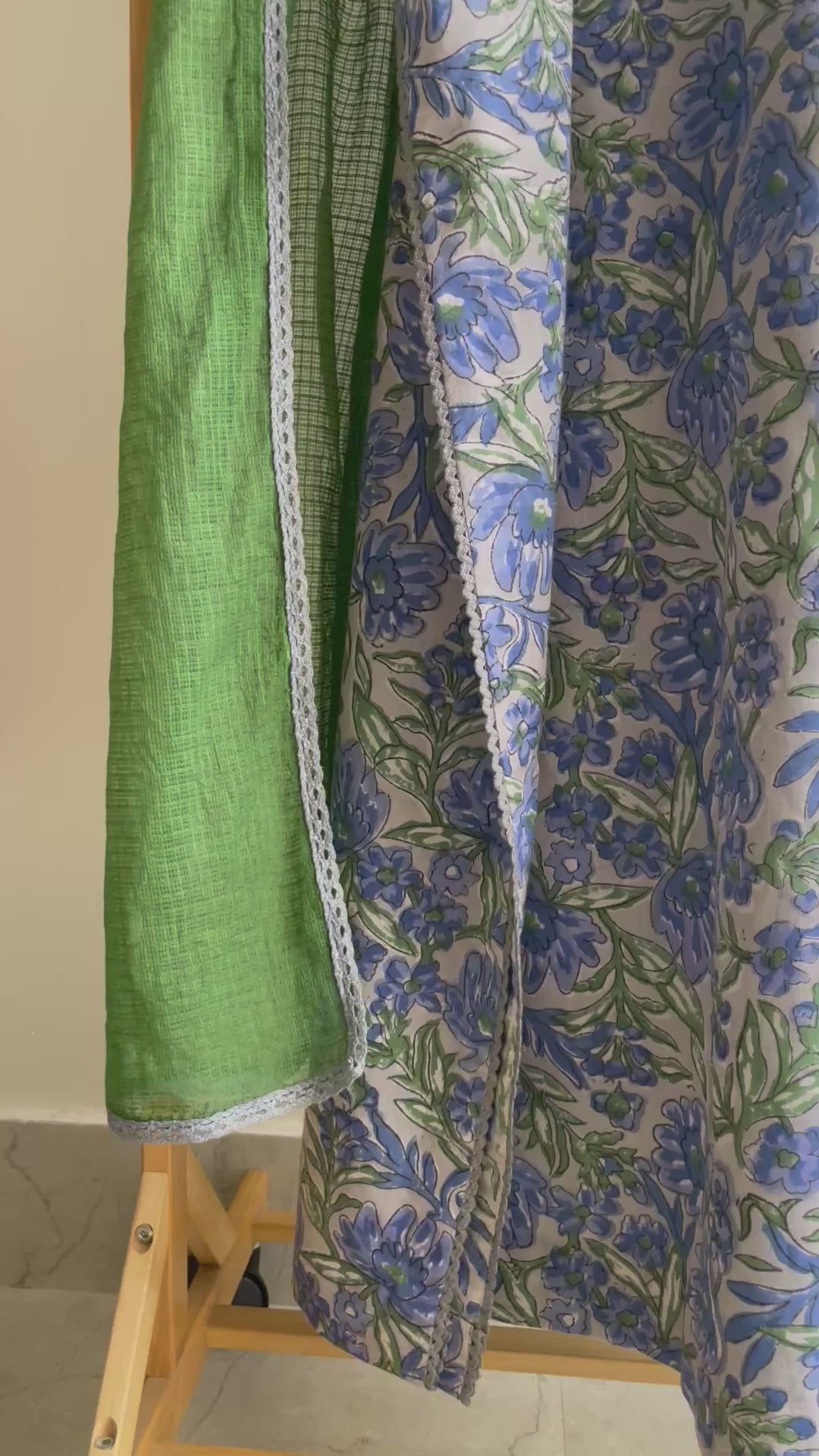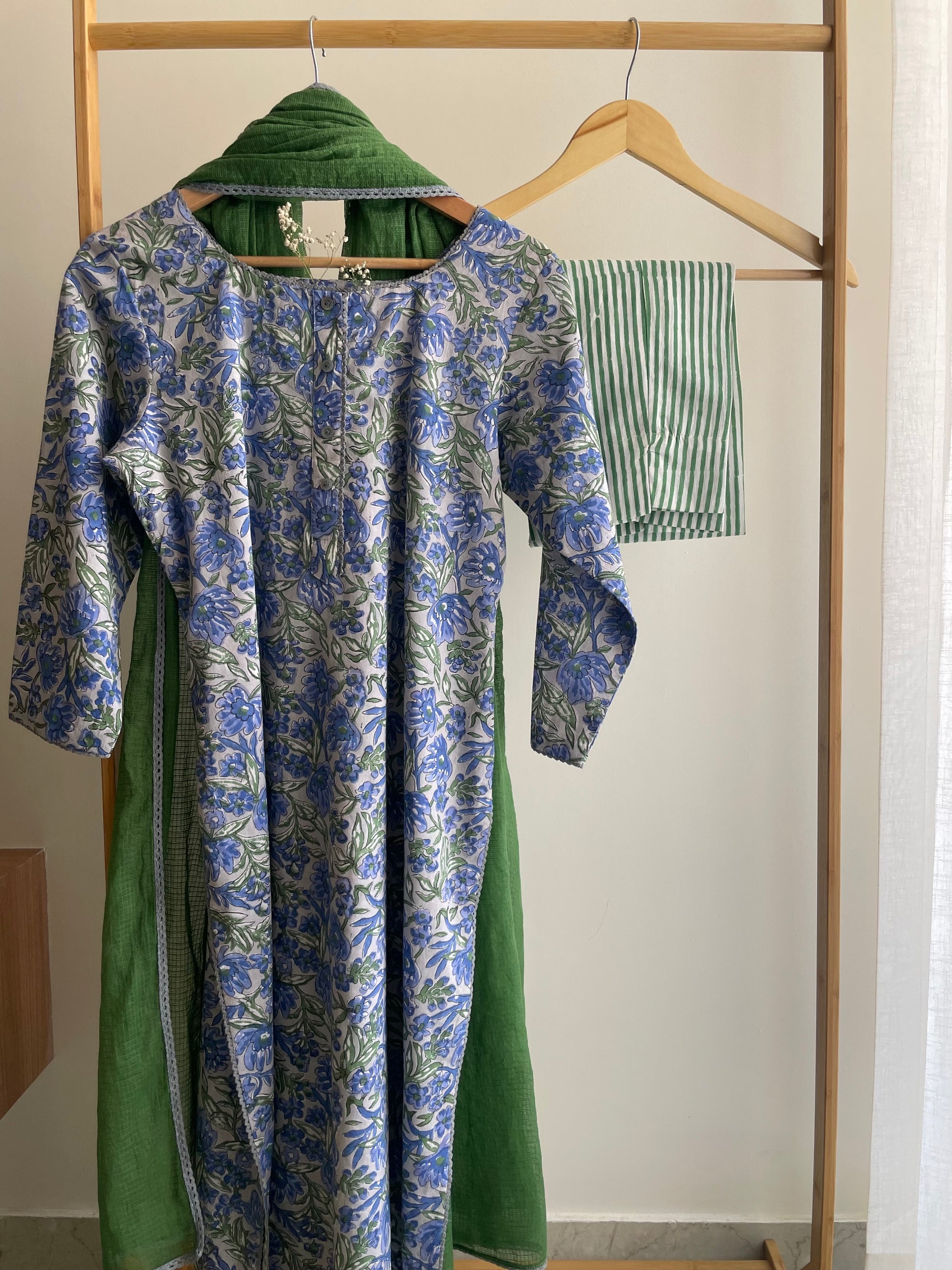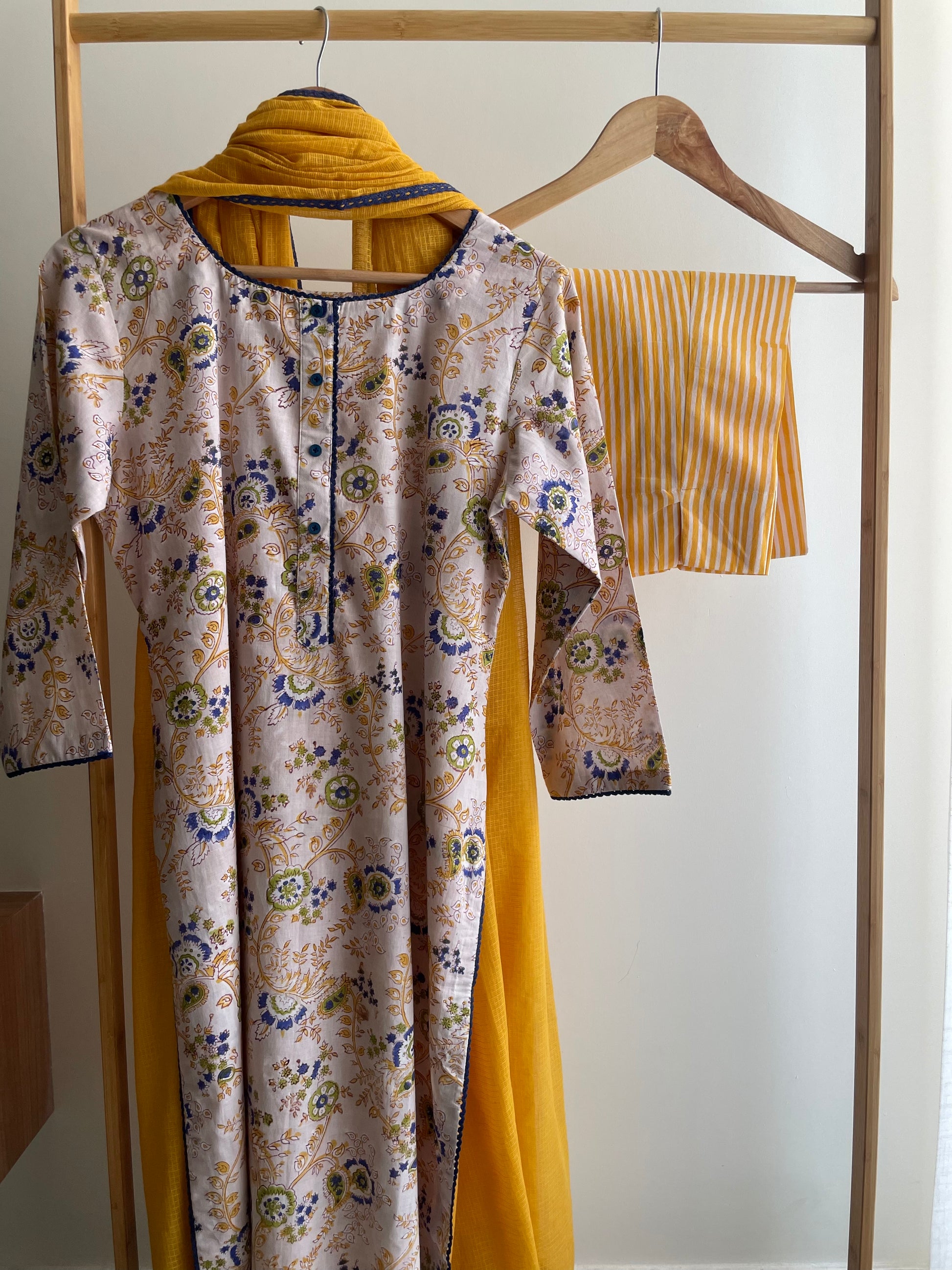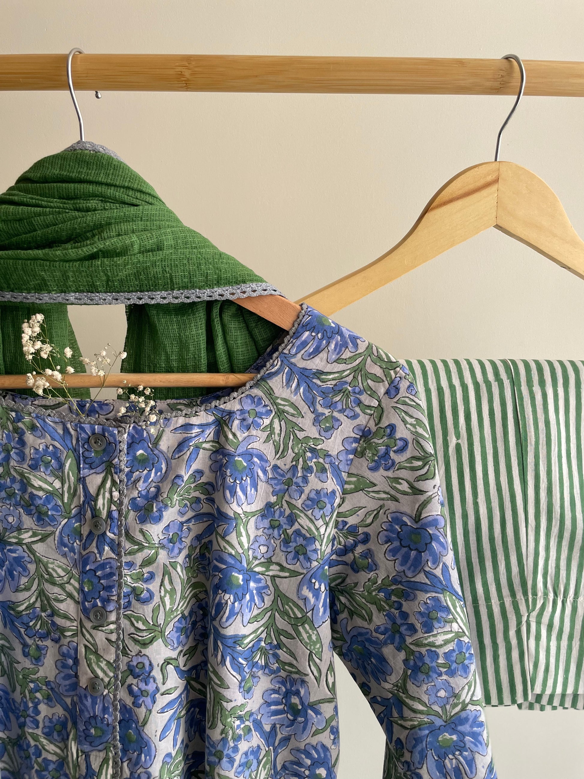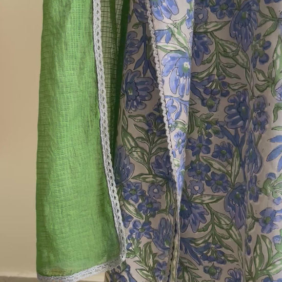 New sets in combination of hand block printed stripes and hand block printed breezy cottons. The sets are enhanced with crochet lace all over. Kota dupatta is paired with these sets in contrasting colours enhancing the whole look. This set is perfect for your wardrobe this season.