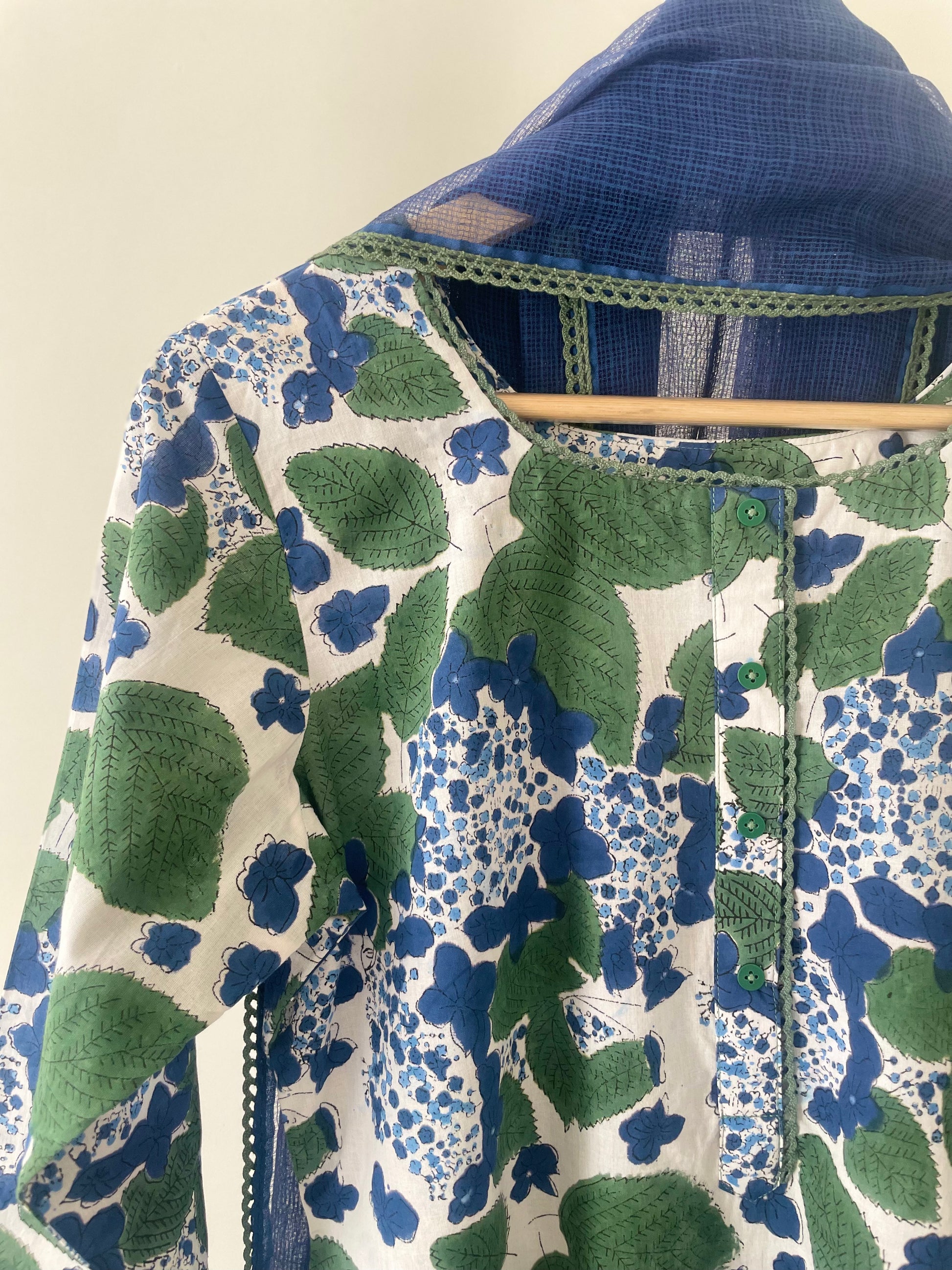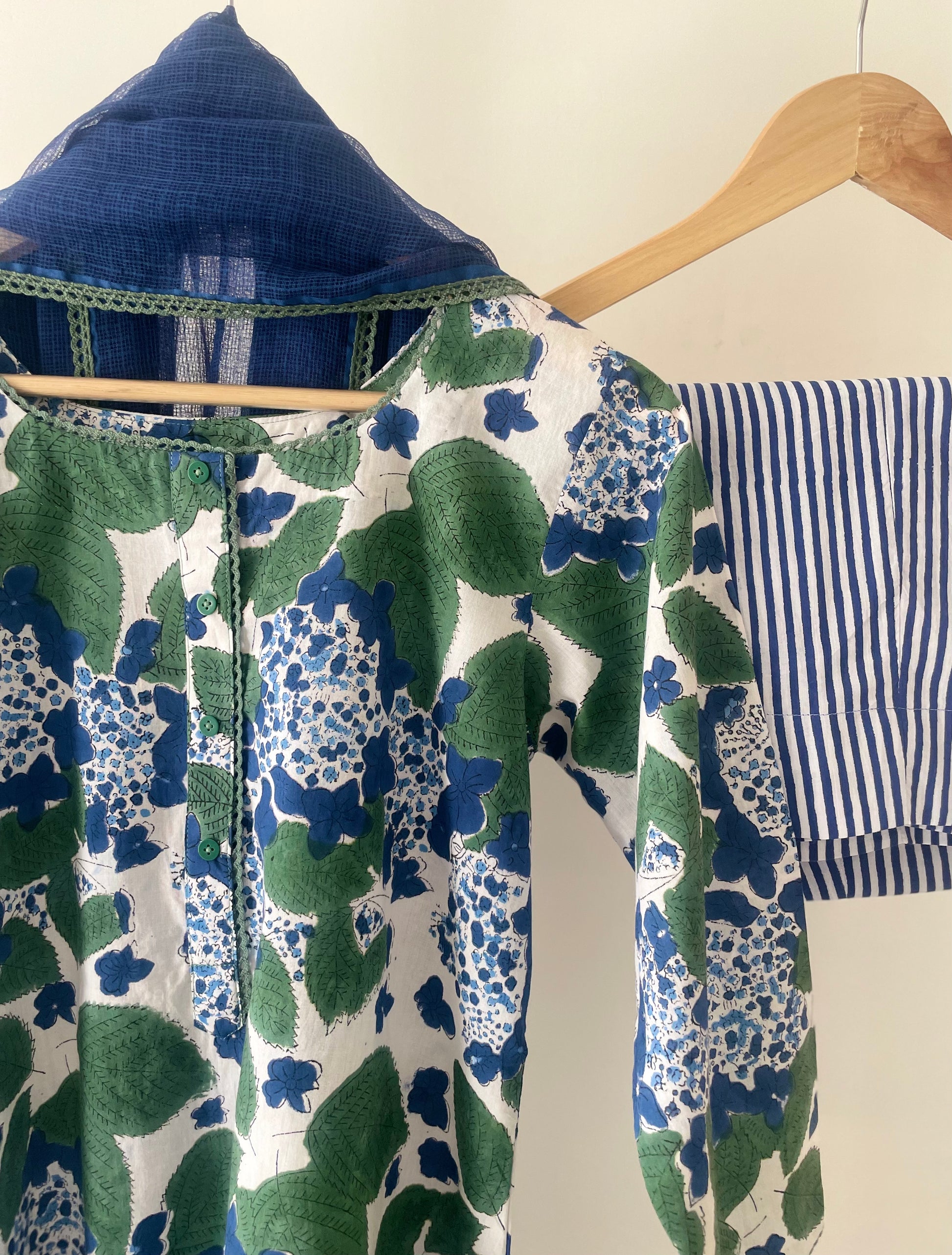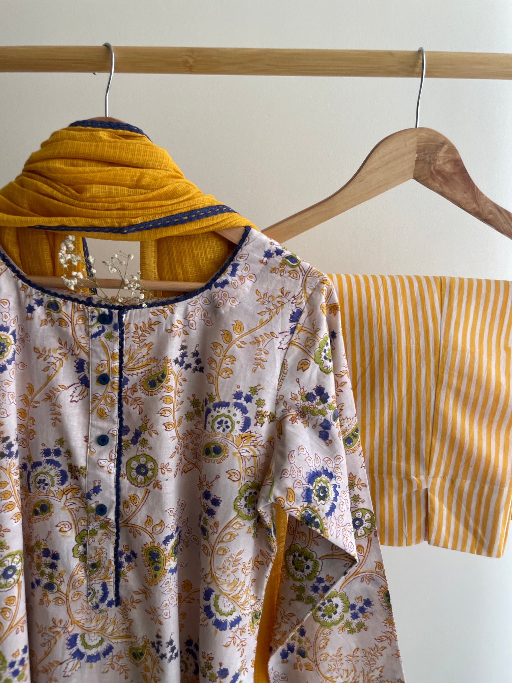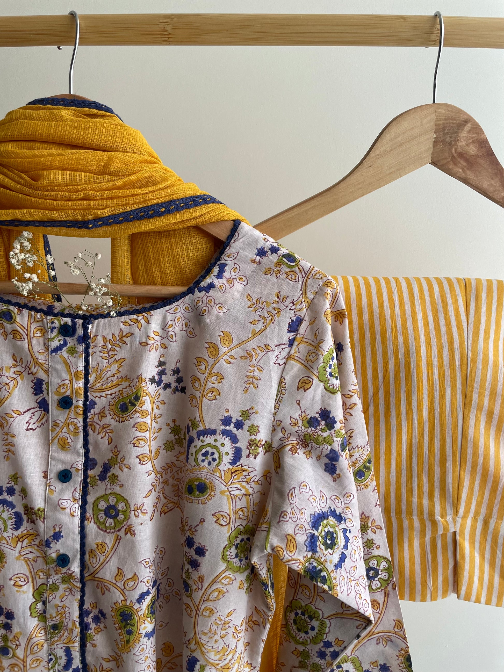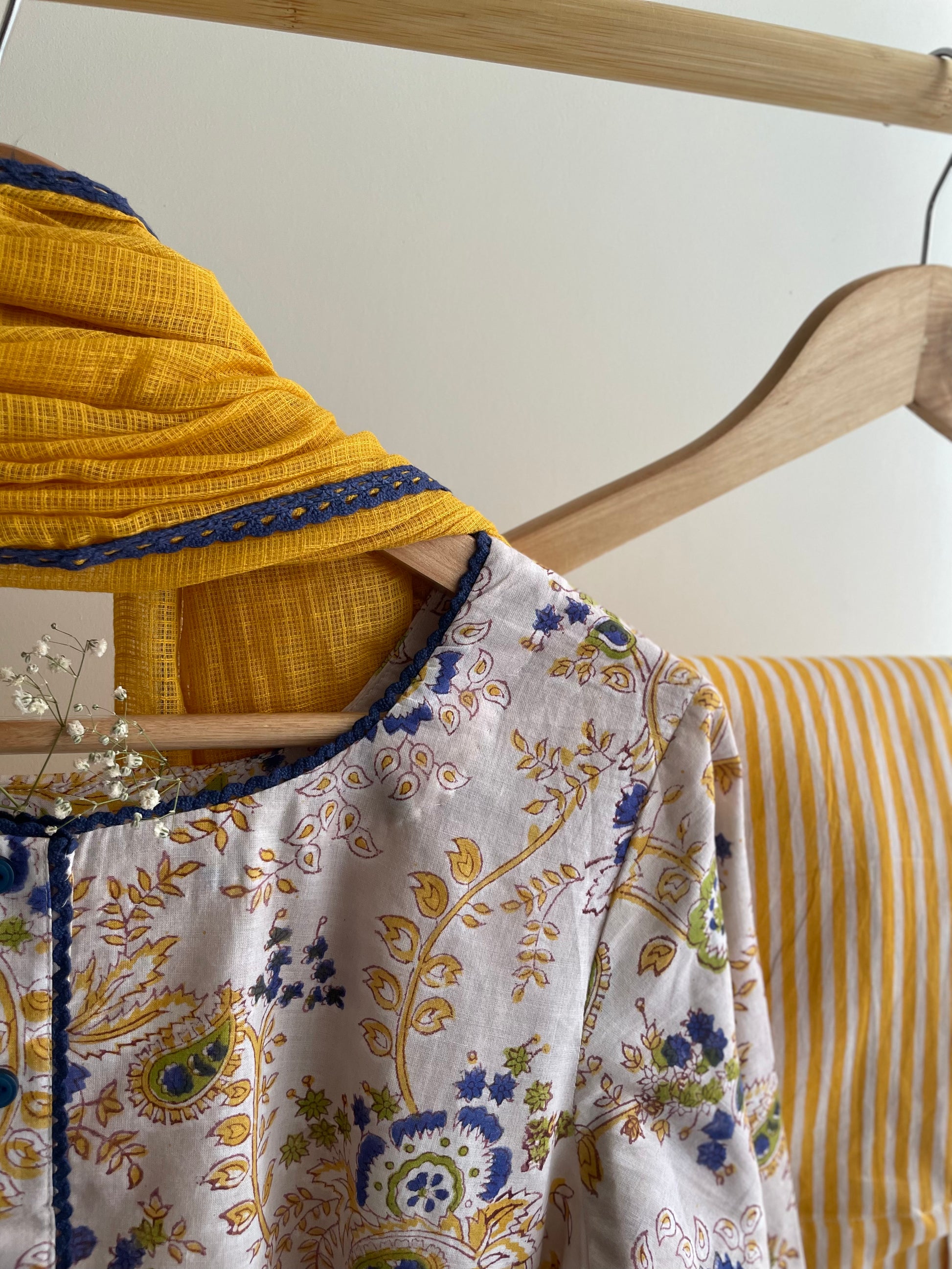 New sets in combination of hand block printed stripes and hand block printed breezy cottons. The sets are enhanced with crochet lace all over. Kota dupatta is paired with these sets in contrasting colours enhancing the whole look. This set is perfect for your wardrobe this season.