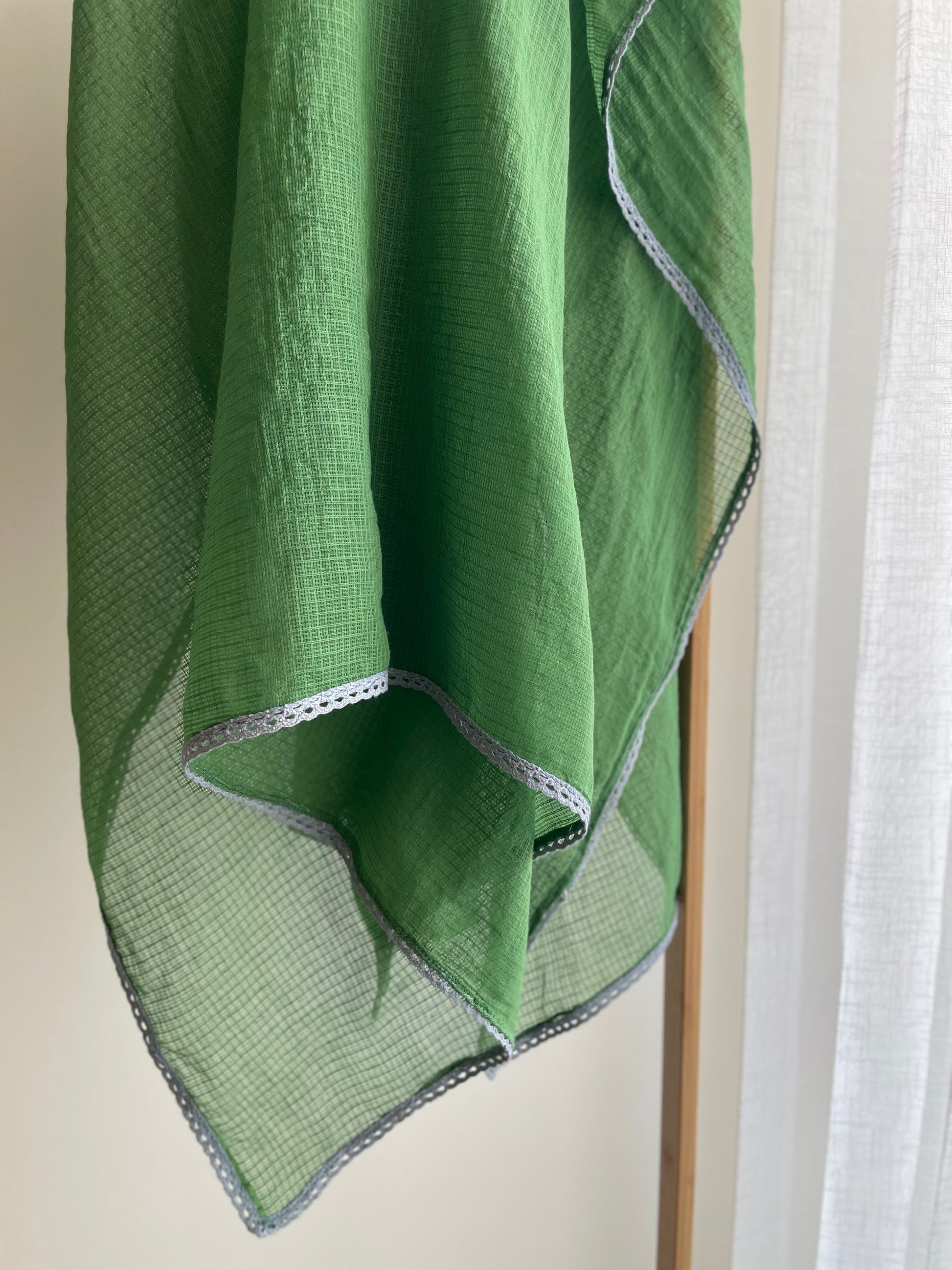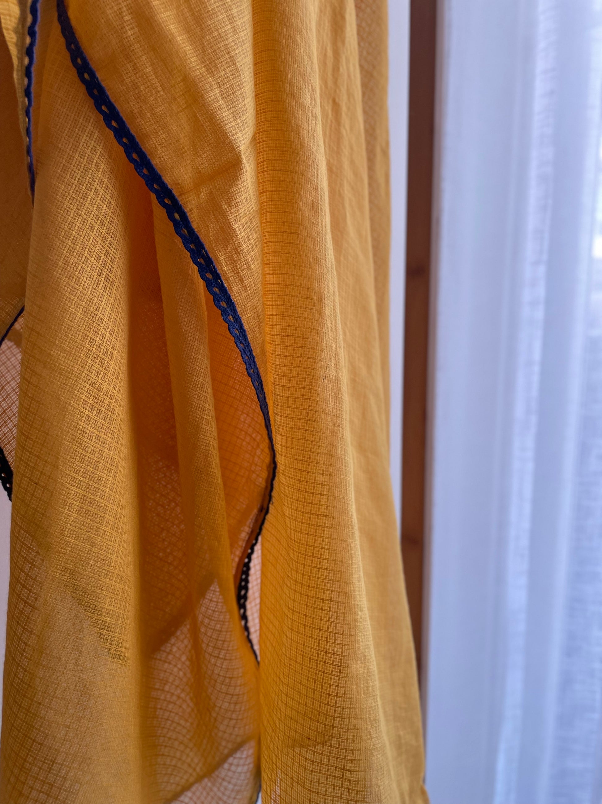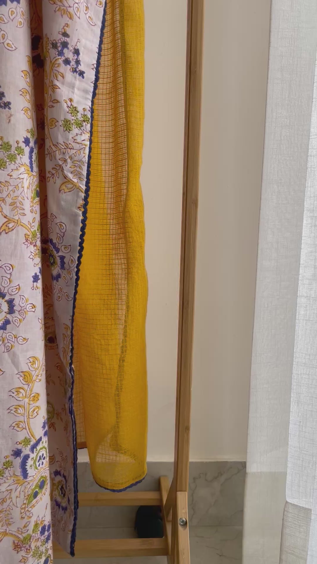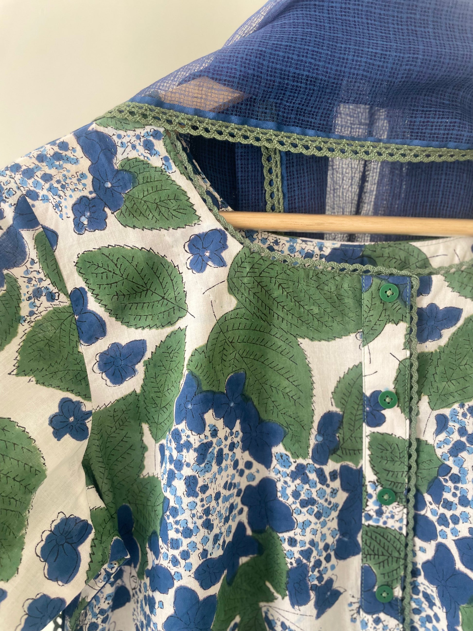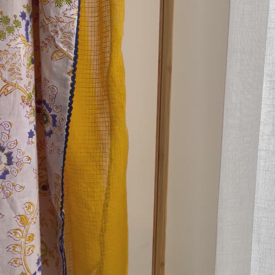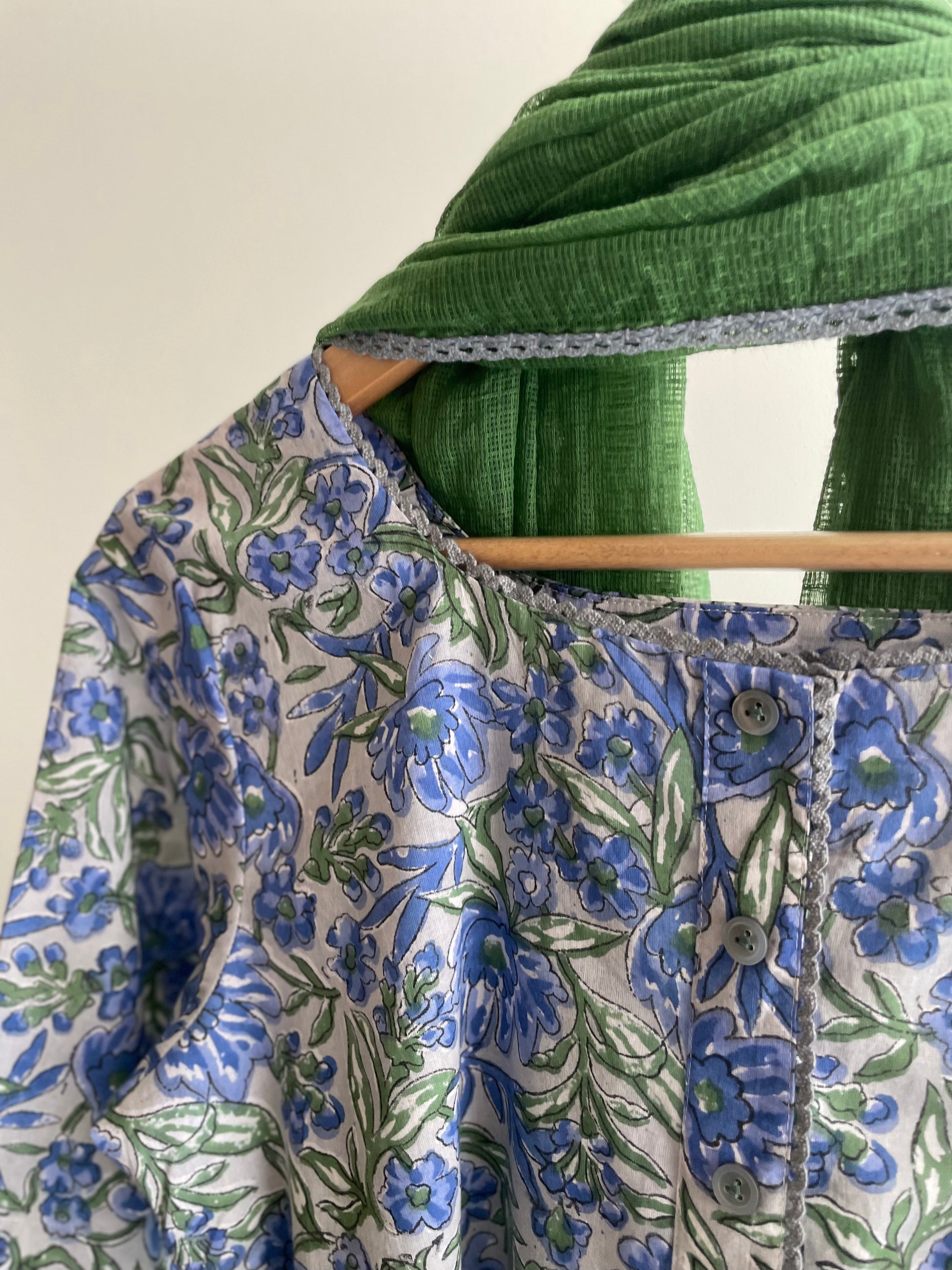 New sets in combination of hand block printed stripes and hand block printed breezy cottons. The sets are enhanced with crochet lace all over. Kota dupatta is paired with these sets in contrasting colours enhancing the whole look. This set is perfect for your wardrobe this season.