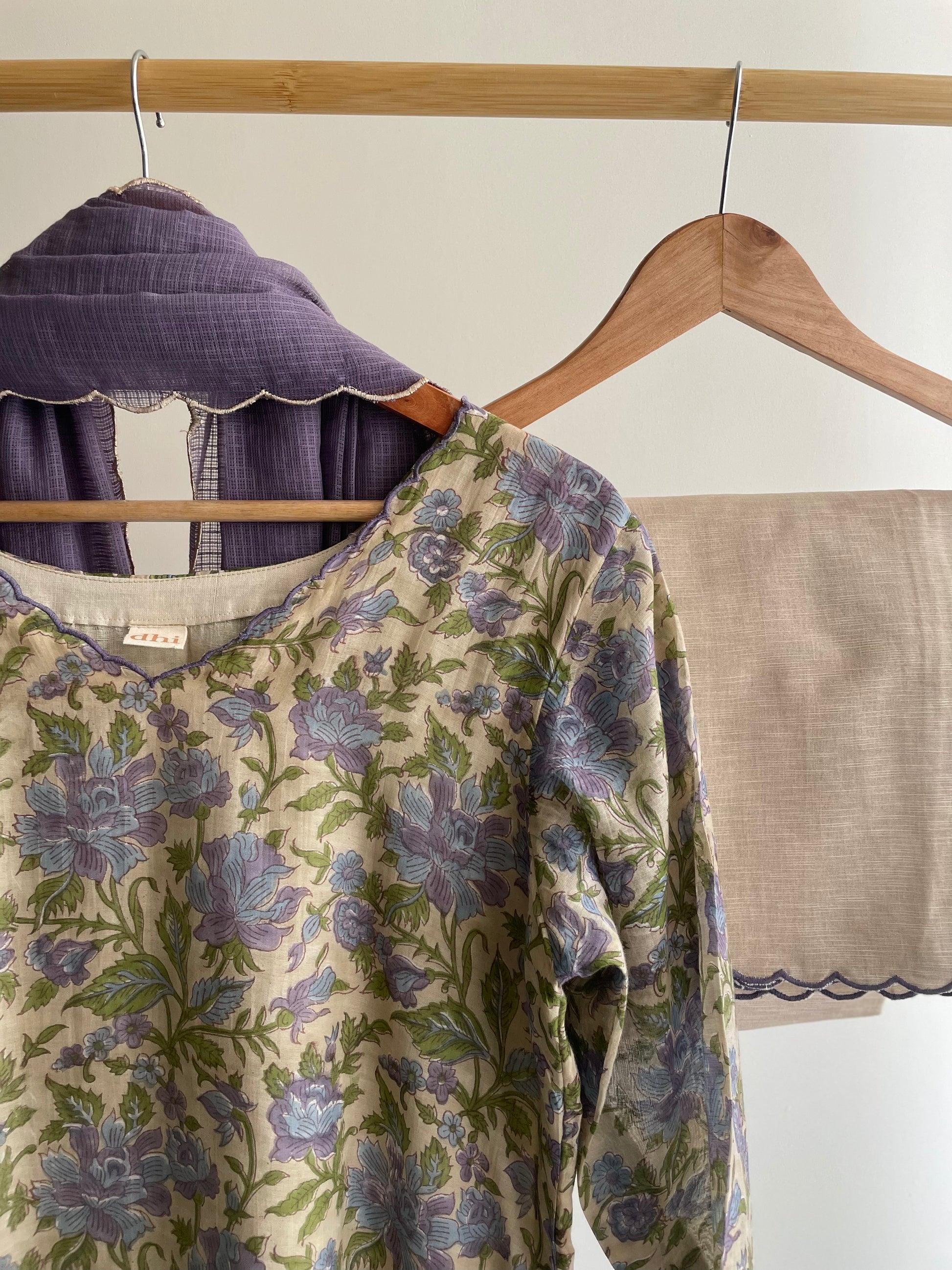 The set is beautifully done in combinations. The kurta is done in hand block print floral pattern paired with tone on tone scalloped pants and kota dupatta. The set is elevated with scalloped detailing all over. This set is perfect for your festive wardrobe.